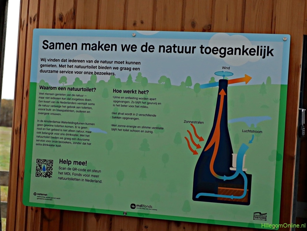 Een natuurtoilet is een composttoilet en heeft geen riool, water of elektriciteit nodig. Het natuurtoilet is ook geschikt voor rolstoelgebruikers. Urine en ontlasting wordt apart opgevangen. Zo blijft het geurvrij en is het beter voor het milieu. Het afval wordt in 2 verschillende bakken opgevangen. Met zonne-energie en slimme ventilatie blijft het toilet schoon en zuinig. Daarbij wordt het toilet 2x per week goed schoongemaakt. Het MDL Fonds (voorheen maag, darm, lever Stichting) en Waternet (Amsterdamse Waterleidingduinen) willen graag dat natuur toegankelijk is voor iedereen. Door een tekort aan toiletten blijkt dat 1 op de 4 Nederlanders besluit niet te gaan wandelen. Met de plaatsing van een natuurtoilet speelt Waternet in op de wens van de bezoekers om meer toiletvoorzieningen te faciliteren zonder daarmee water te verspillen of het gebied aan te tasten.