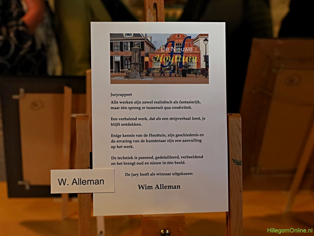 Het winnende kunstwerk is gemaakt door Wim Alleman. De jury was het unaniem eens met elkaar en zei het volgende : “Alle werken zijn zowel realistisch als fantasierijk, maar één sprong er tussenuit qua creativiteit. Een verhalend werk, dat als een stripverhaal leest, je blijft ontdekken. Enige kennis van de Houttuin, zijn geschiedenis en de ervaring van de kunstenaar zijn een aanvulling op het werk. De techniek is passend, gedetailleerd, verbeeldend en het brengt oud en nieuw in één beeld.”