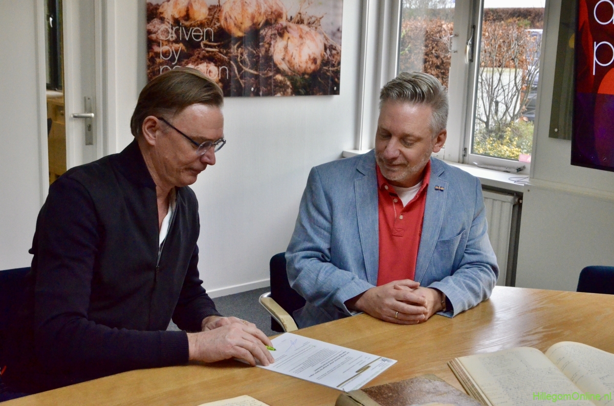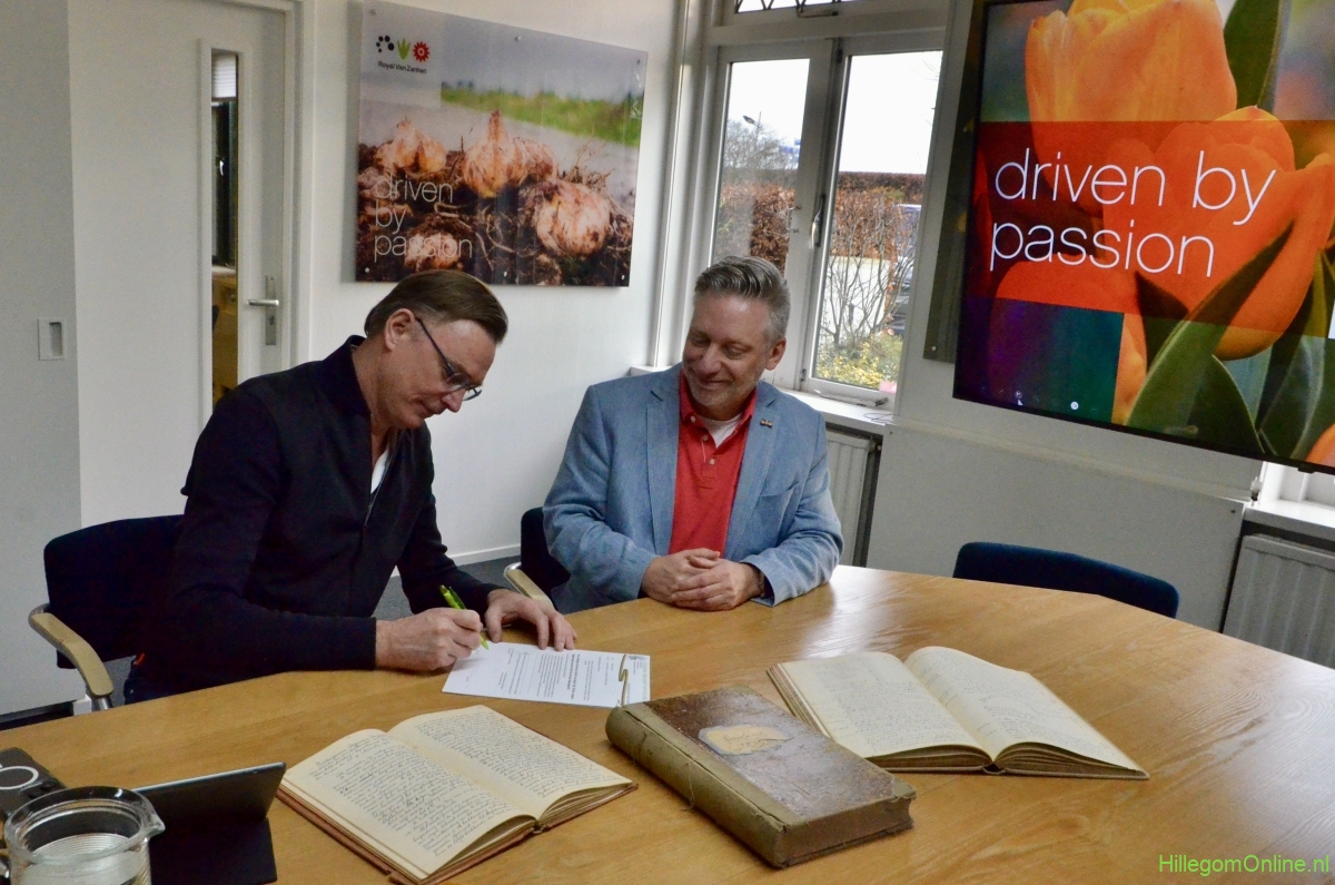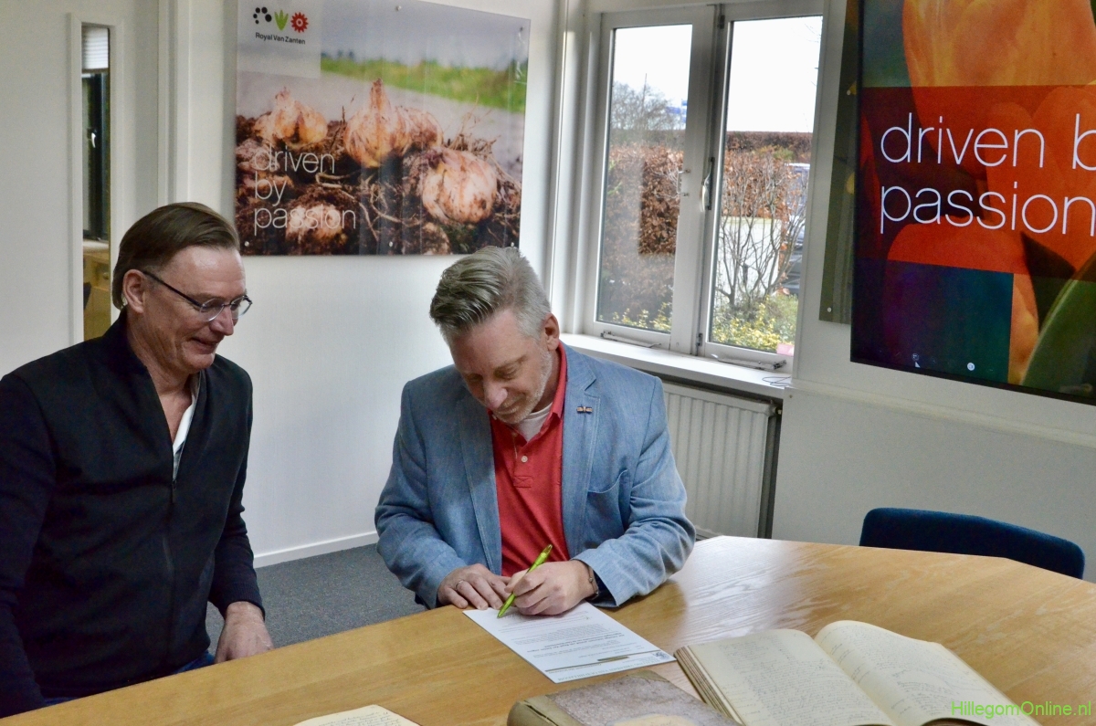 Op 10 december jl. is het zeer waardevolle archief van Royal Van Zanten overgedragen aan de Vrienden van Oud Hillegom. Dit gebeurde door de ondertekening van een akte door Klaas Jan Vijn, algemeen directeur van Van Zanten Flowerbulbs en Wilbert Koops, voorzitter van de Vrienden van Oud Hillegom.