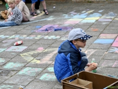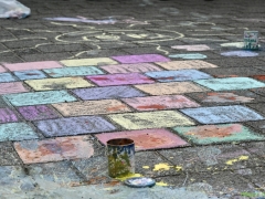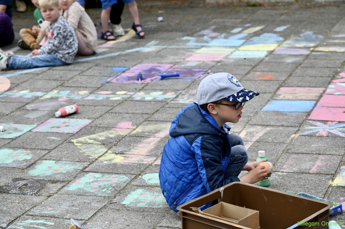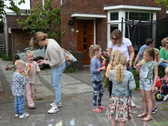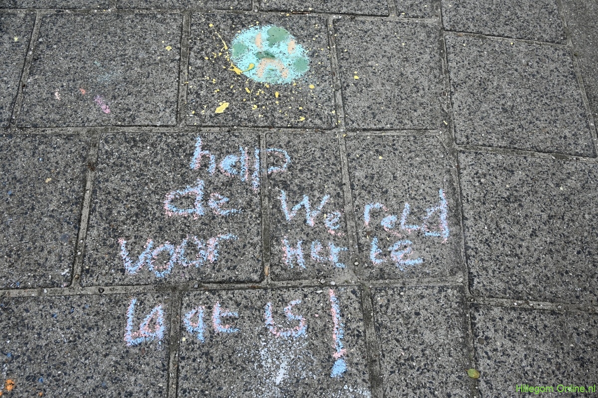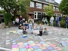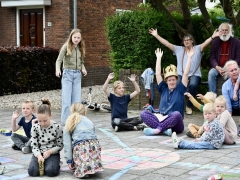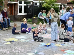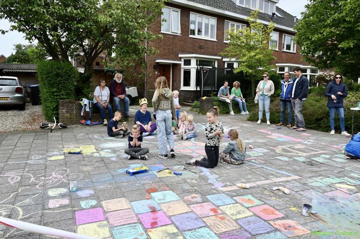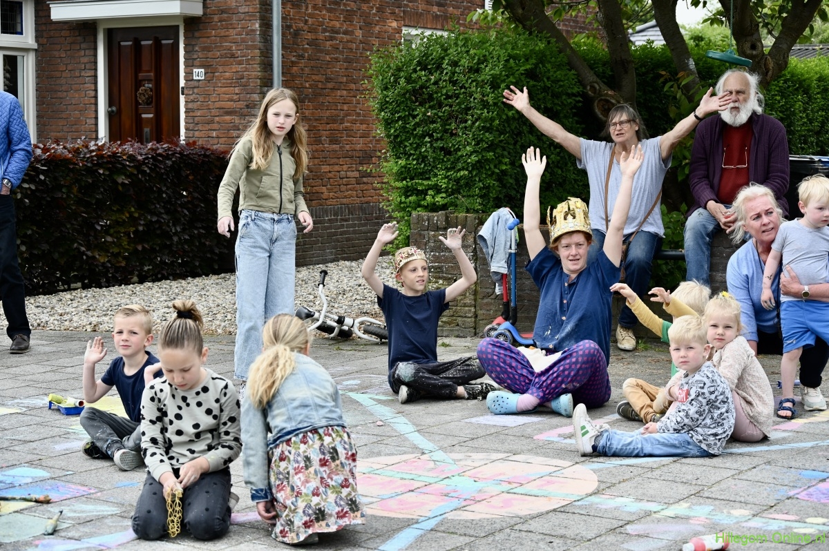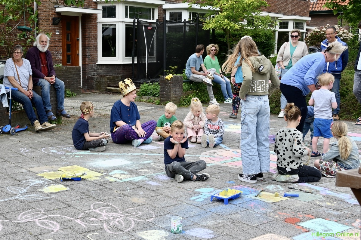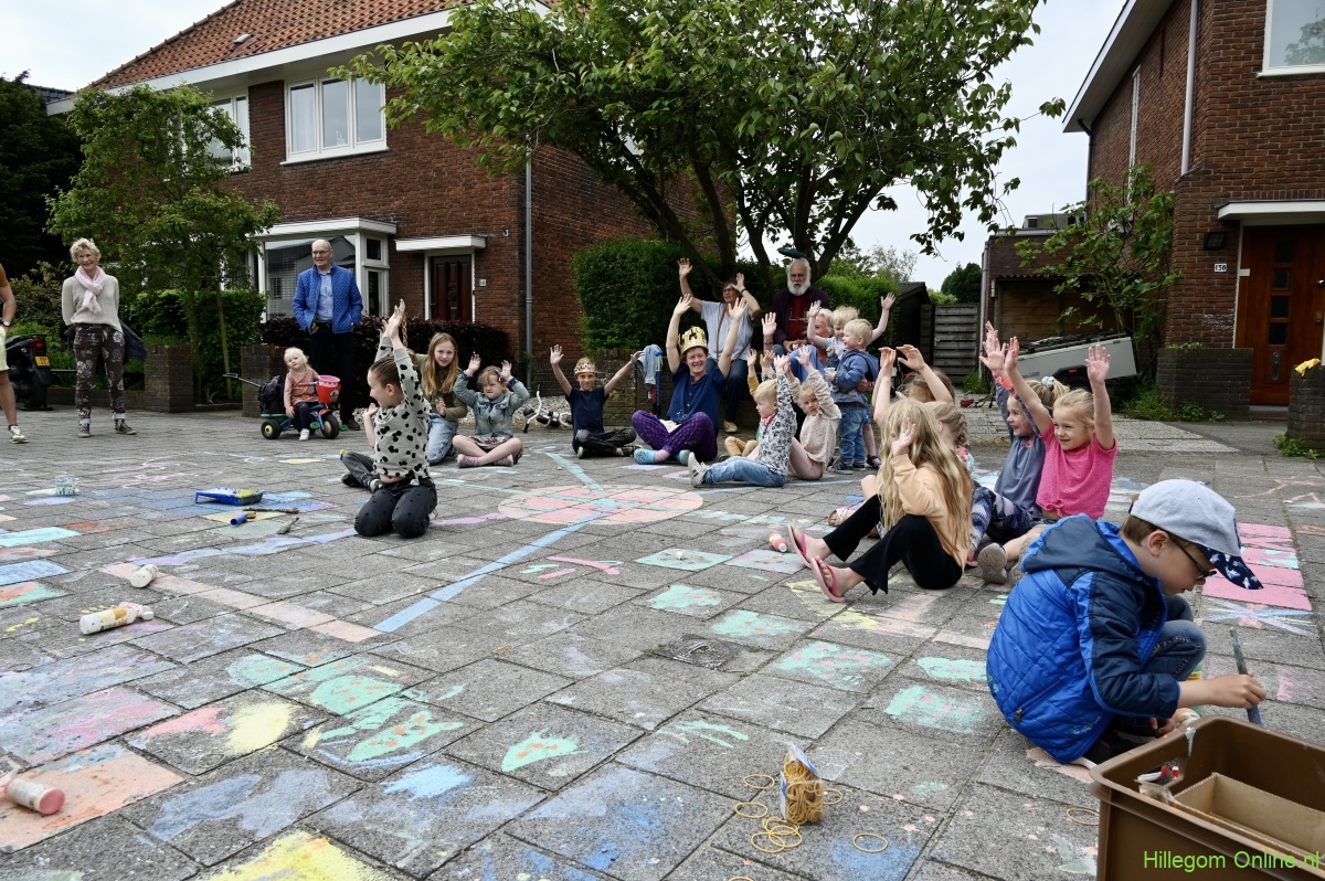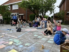 Hillegom – Vanmorgen kwam ‘stoepkrijtkoningin’ Etty Kastein samen met kinderen uit buurtvereniging de Buurt in actie, om de grote stoep in de bocht van de 2e Loosterweg om te toveren tot een kleurrijke stoep.