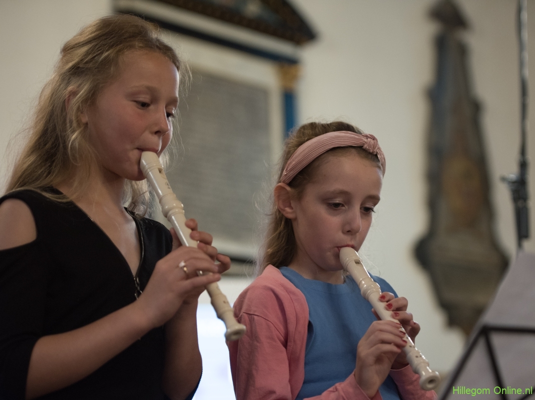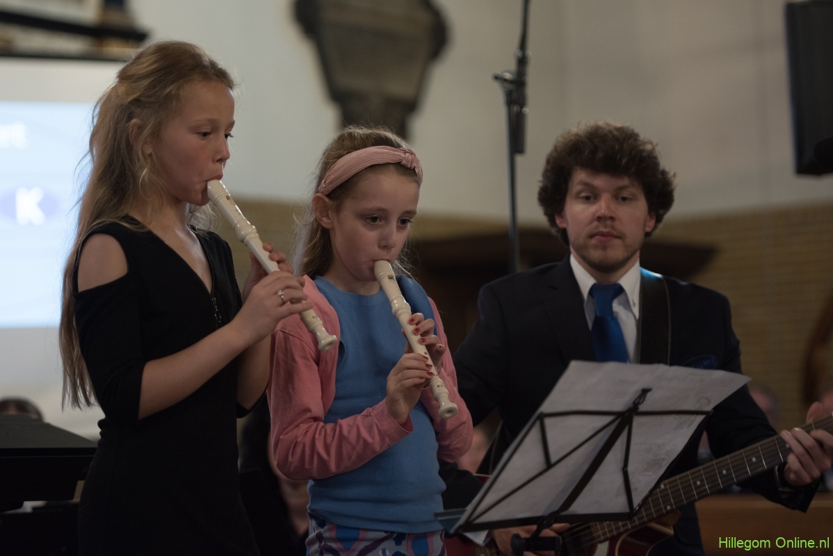 Na het harmonieorkest kwamen twee jonge leerlingen naar voren. Zij zijn bezig met de basisopleiding muzikale vorming op de blokfluit en mochten met zijn tweetjes hun kunsten laten horen. Zo jong en dan al voor zo’n groot publiek moeten staan, dat is best wel spannend. Maar begeleid door hun leraar Jeroen Bijl op de gitaar, werd het een foutloos optreden wat een groot applaus opleverde.